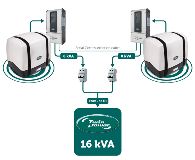 Having recently already been upgraded, WhisperPower’s complete range of compact Genverters - variable speed diesel generators - can now also be supplied with Twin-Power technology. By simply connecting two units with the same power rating in parallel by means of a communication cable, connecting the Genverter’s PMG inverters with each other via the 230 V AC outputs, the nominal power capacity and the peak power capacity can be doubled. Large switch boxes and other additional system components are not required.